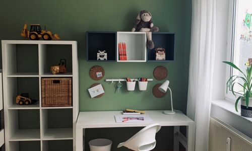 Also wurde die Malerrolle geschwungen und eine Wand grün gestrichen. Als nächstes haben die Fenster schlichte Vorhänge bekommen und ein Teppich durfte auch nicht fehlen. Danach folgte der Schreibtisch mit Stuhl und passender Leuchte.