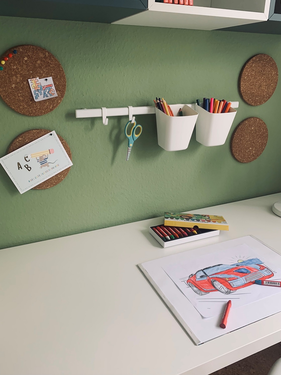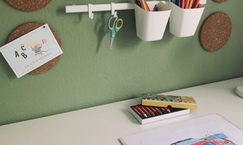 Abgerundet wurde das Ganze mit drei Würfel für Bücher, Stiftebecher und kleinen Pinnwänden für die zukünftigen Kunstwerke.
