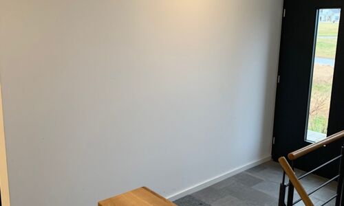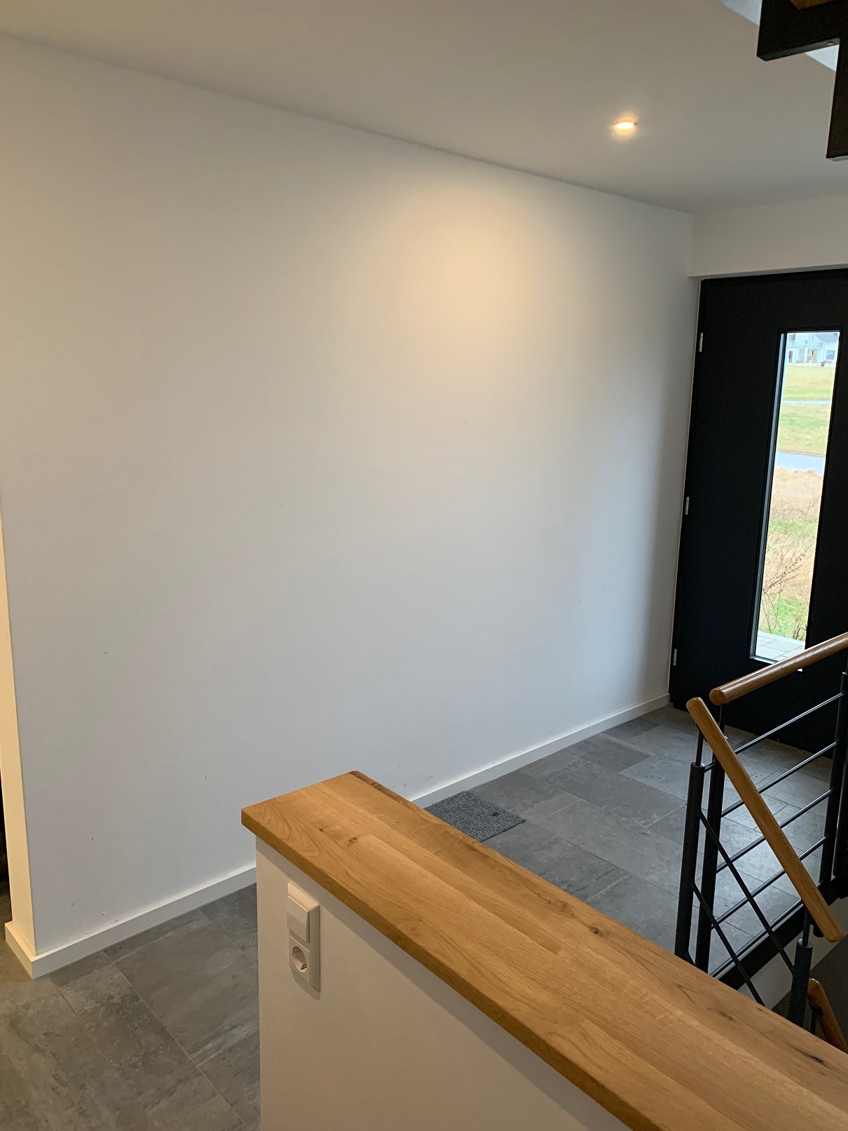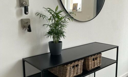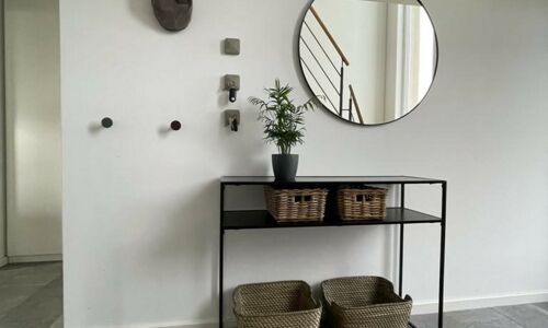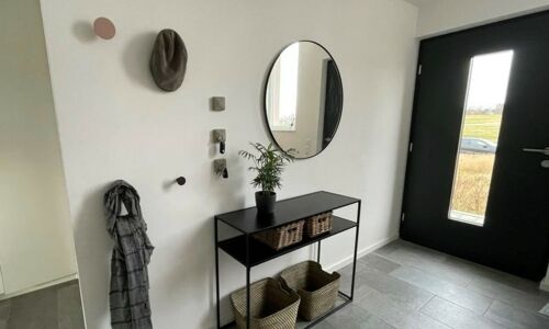 Hier war im Eingangsbereich eine komplett weiße „Leinwand“, welche es zu gestalten galt. Da um die Ecke bereits ein großer Einbauschrank für Jacken und Schuhe zur Verfügung steht, bestand der Wunsch noch eine Ablage für Dies und Das, sowie eine Möglichkeit für das schnelle Aufhängen von Jacken zu schaffen.