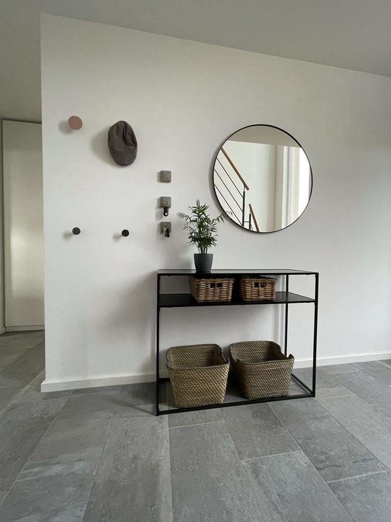 "Der kleine schmale Flur war eine "Problemzone". Mir fehlte hier einfach die Vorstellungkraft und Inspiration. Auf die Idee mit den Knöpfen für Jacken wäre ich nie gekommen, meine Kinder lieben die Aufhänger auf ihrer Höhe. Mit dem Spiegel und der Konsole (übrigens aus zweiter Hand erworben) ergibt die ungewöhnliche Anordnung einen runden ersten Eindruck beim Hereinkommen ins Haus."