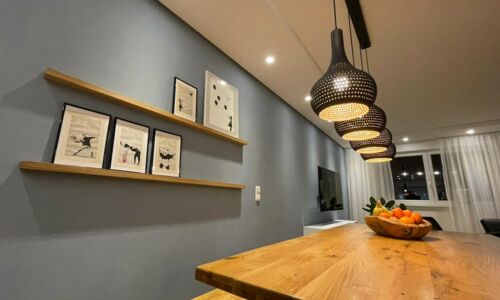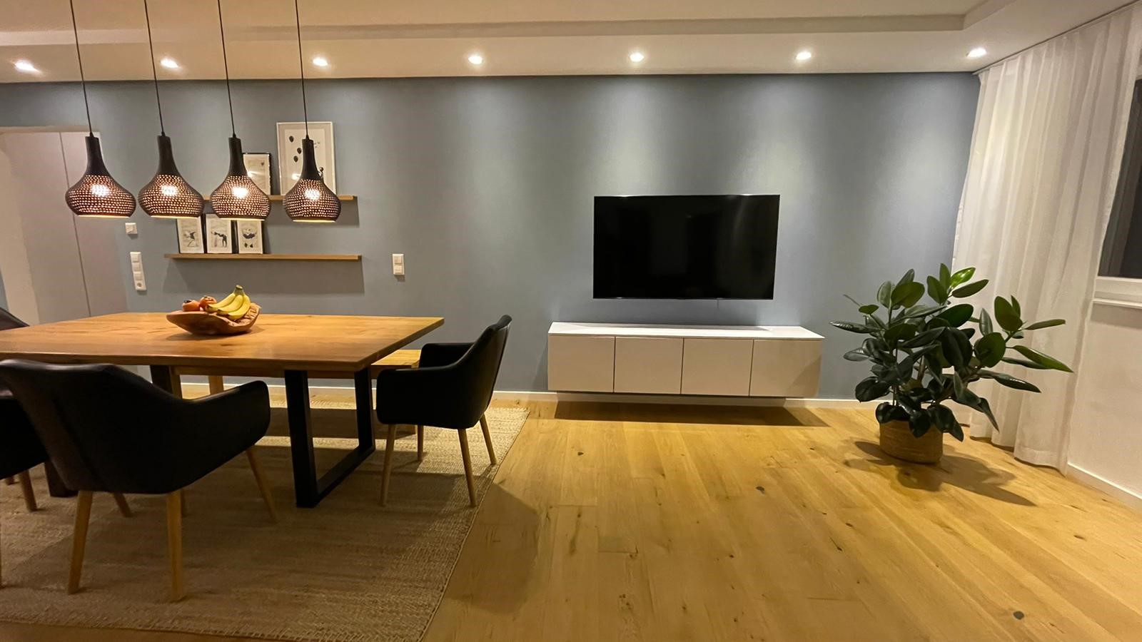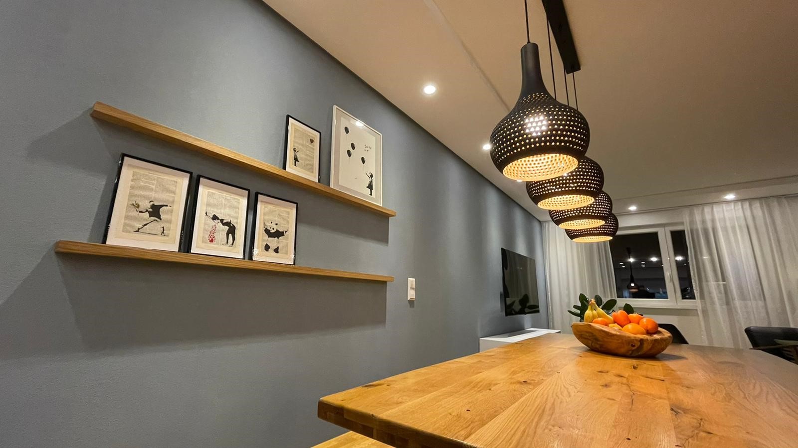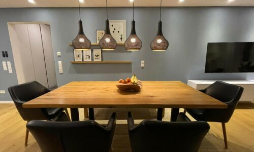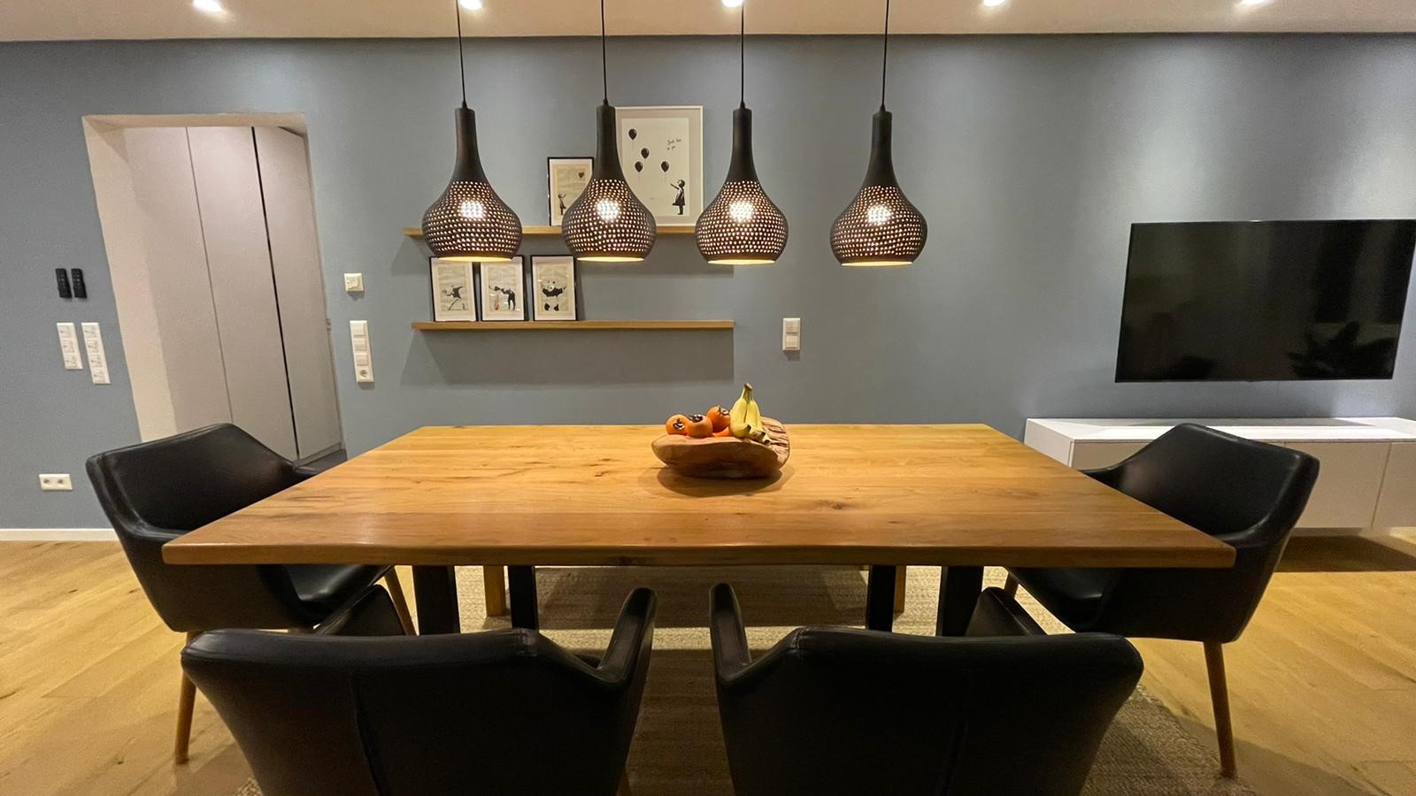 Wir haben hier einen wunderschön geschnittenen, großen Wohn- Essbereich mit einer offenen Küche. Was hier noch fehlte war eindeutig Farbe! Mit diesem wahnsinnig tollen blau-grau ist der Raum nun optisch besser greifbar, hat mehr Tiefe bekommen und der gewünschte Wohlfühlcharakter konnte geschaffen werden. Abgerundet wurde das Ganze durch zwei schmale Bilderleisten aus massiver, geölter Eiche mit einer wunderschönen Maserung.