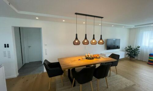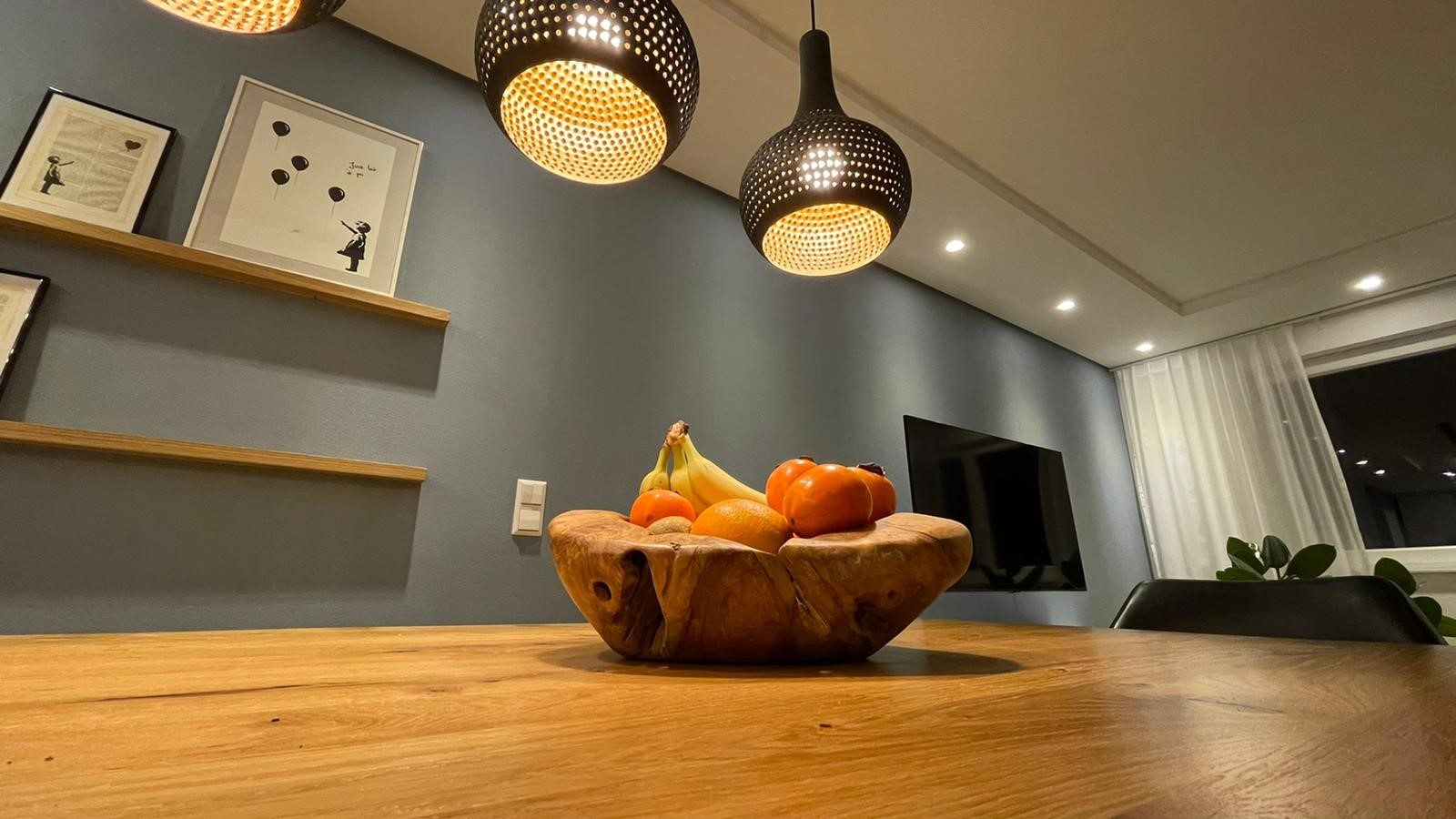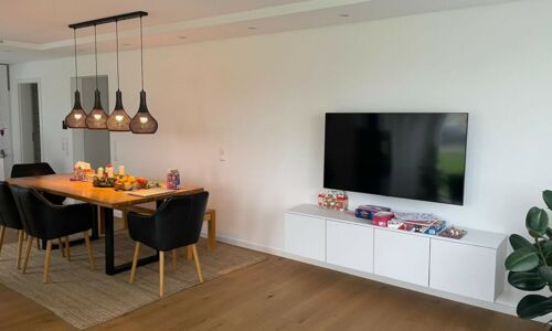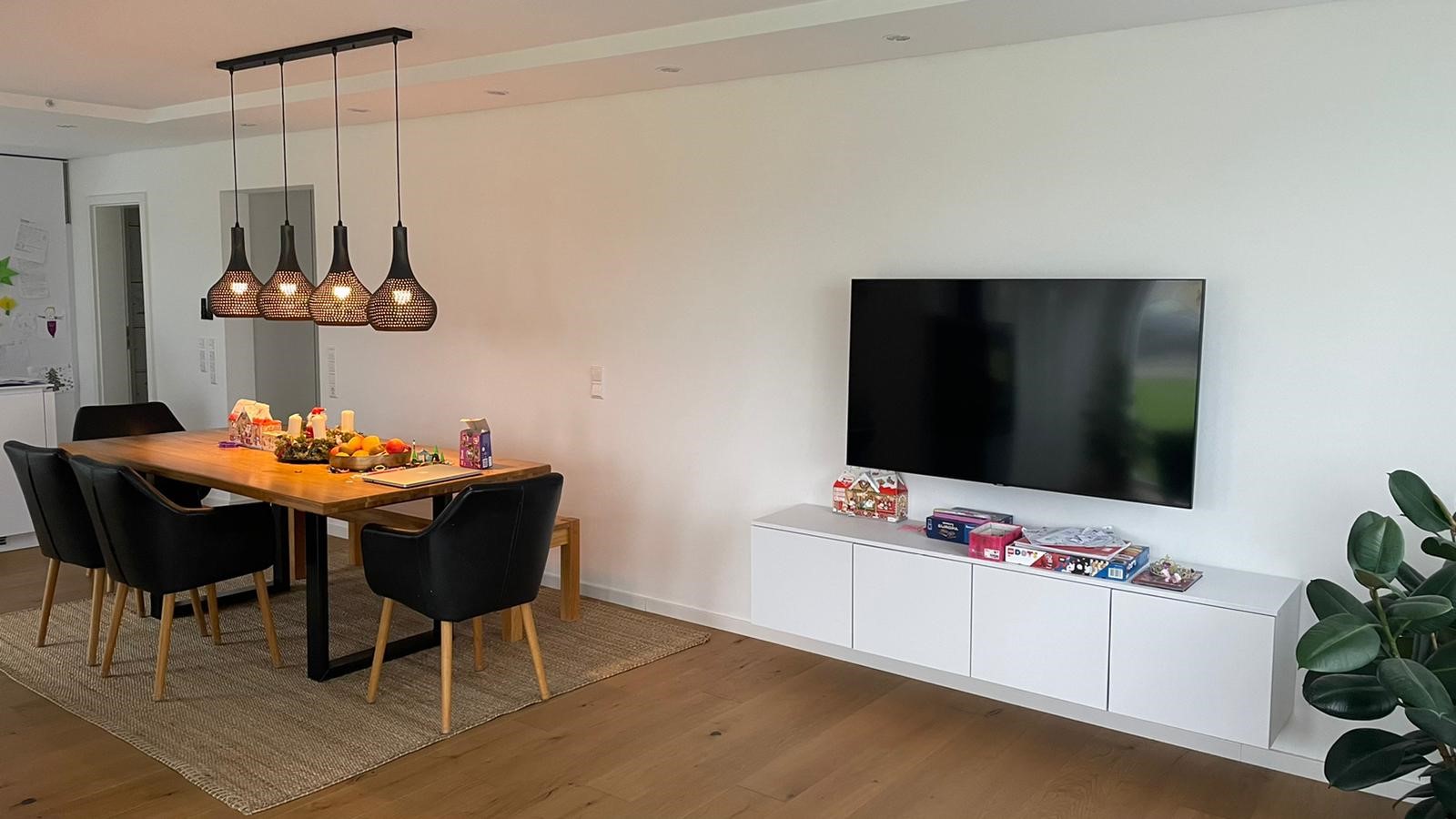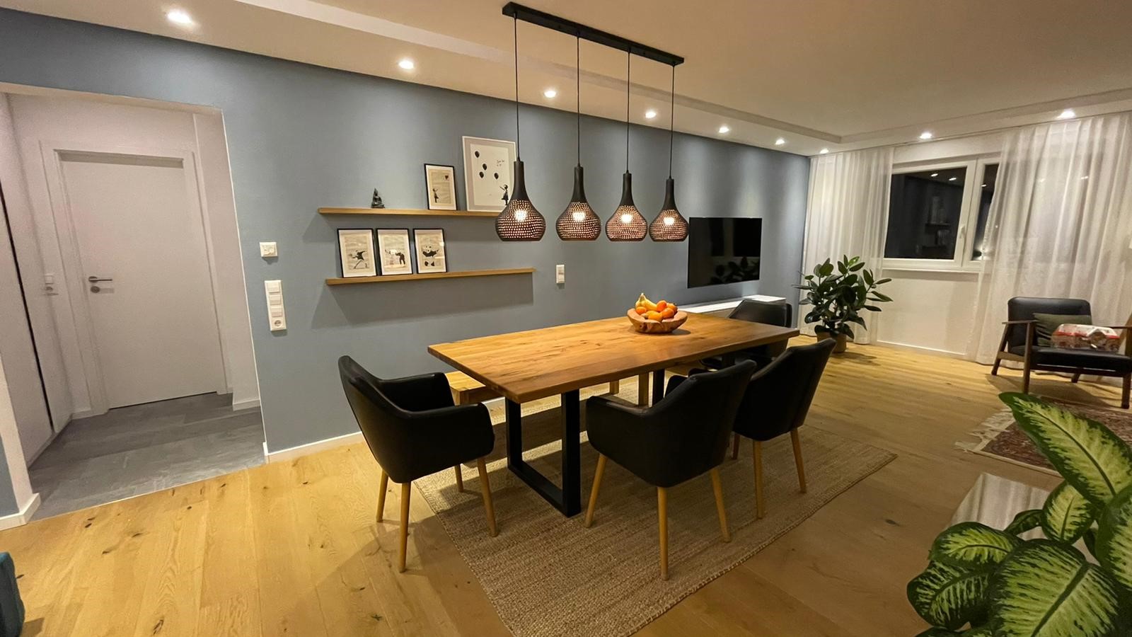 Wir haben hier einen wunderschön geschnittenen, großen Wohn- Essbereich mit einer offenen Küche. Was hier noch fehlte war eindeutig Farbe! Mit diesem wahnsinnig tollen blau-grau ist der Raum nun optisch besser greifbar, hat mehr Tiefe bekommen und der gewünschte Wohlfühlcharakter konnte geschaffen werden. Abgerundet wurde das Ganze durch zwei schmale Bilderleisten aus massiver, geölter Eiche mit einer wunderschönen Maserung.