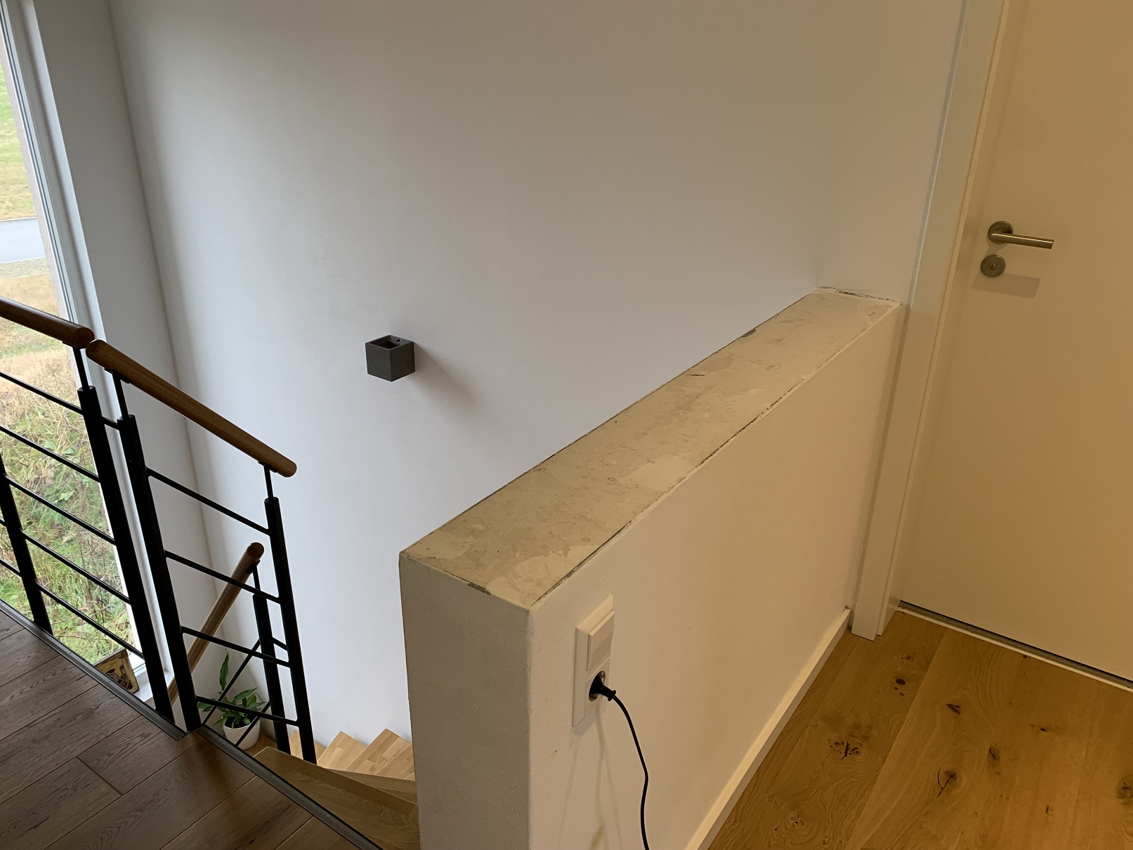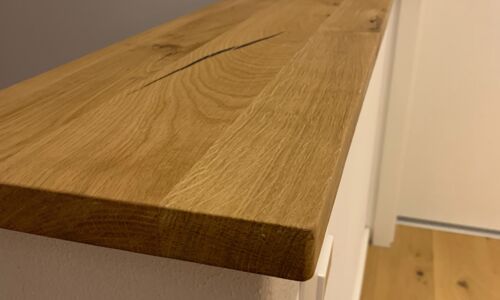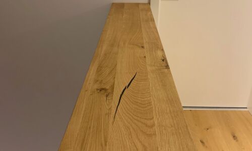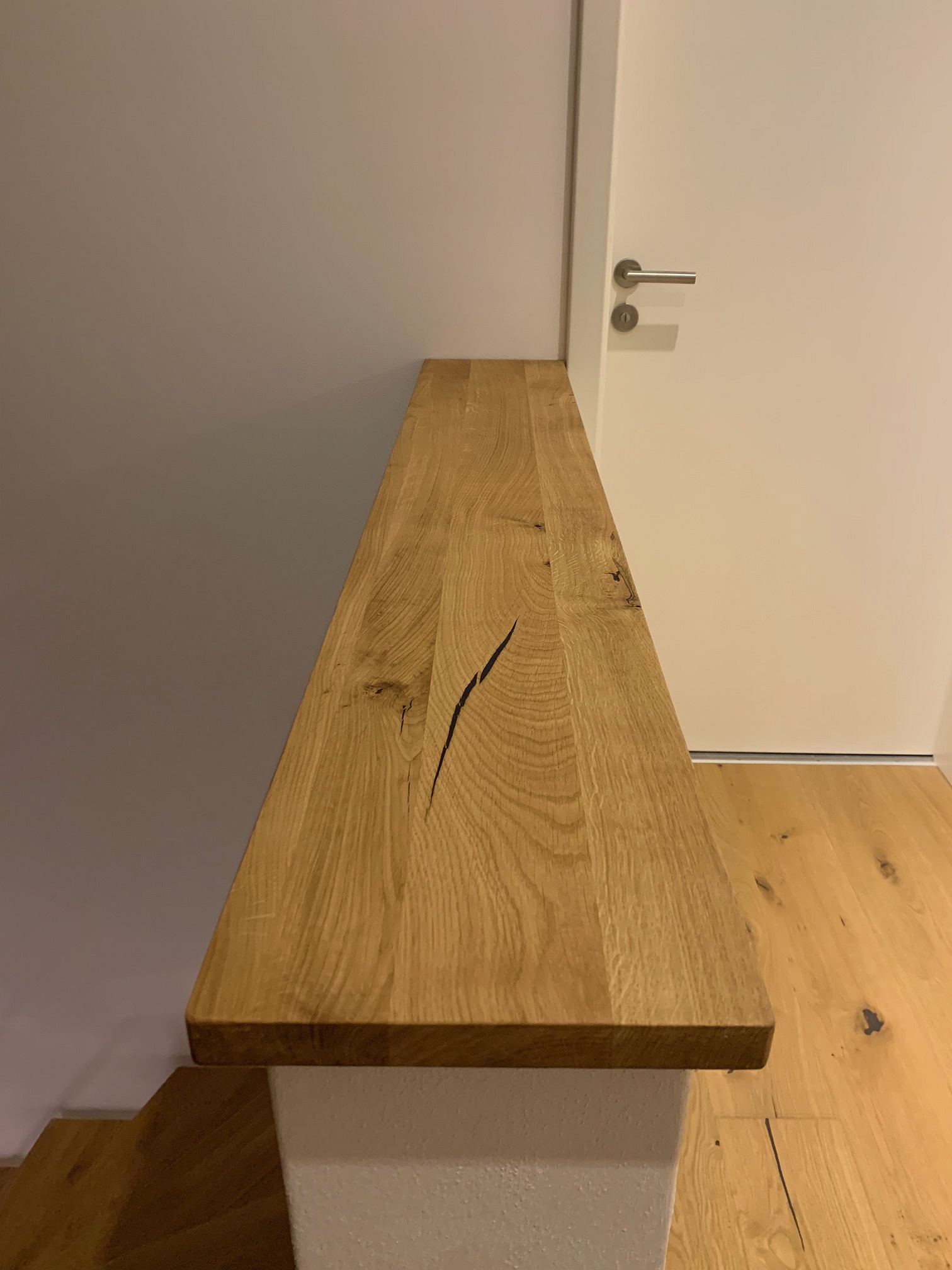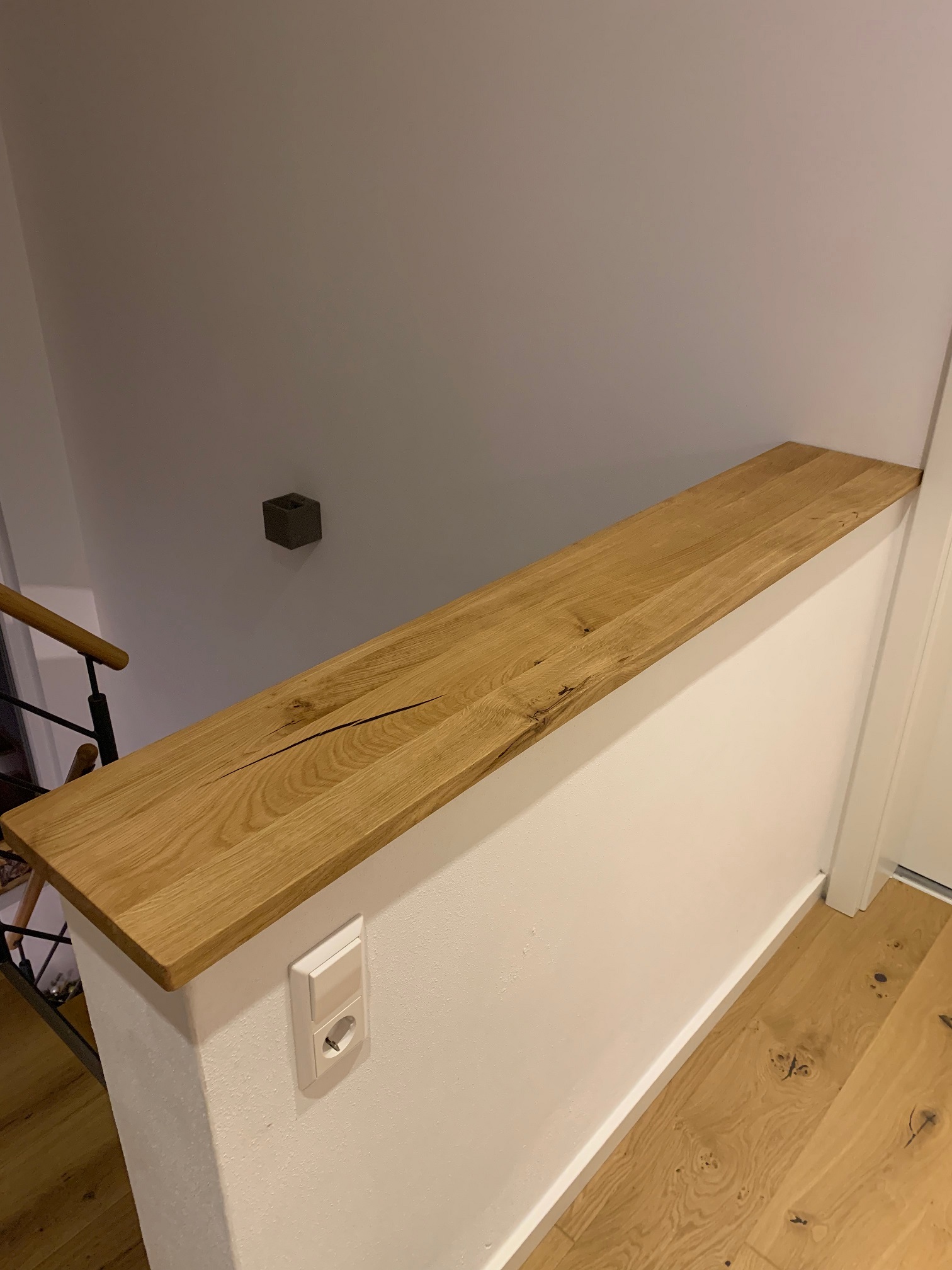 In diesem Treppenhaus wurde neben einem klassischen Metallgeländer eine Mauer als Fallschutz errichtet. Nun fehlte noch die passende Abdeckung um das Gesamtbild abzurunden. Die Wahl fiel auf eine massive Eichenplatte mit wunderschöner Maserung.