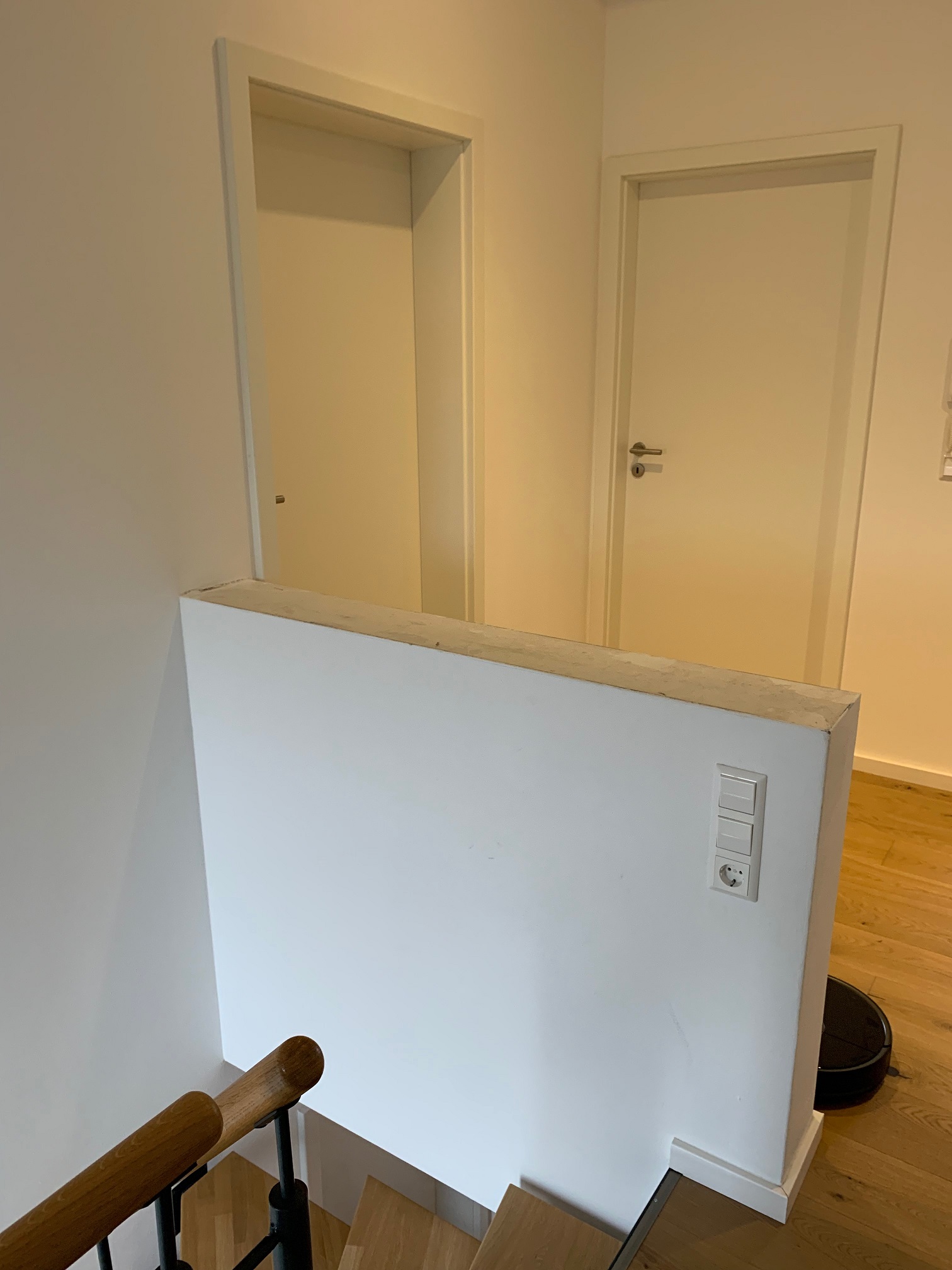 "Nach dem Einzug hatten die Vormauerungen keine Abdeckung. Wir waren einfach froh, den Großteil der Arbeiten im Haus beendet zu haben und so blieb diese "Baustelle" erst einmal bestehen. Juliane hat im Handumdrehen das zum Parkett passende Holz ausgewählt und durch ihren Hausschreiner anfertigen und montieren lassen."
